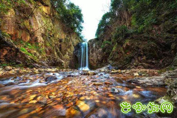 “白云相送出山来,满眼红尘拨不开”。于这山间溪水,倒也是再好不过的了。水从潭边的乱石堆中溢出,周围都是悬崖绝壁,仅仅削蚀一两米宽的口子,瀑布从这个缺口飞泻而下,几十米高,发出“訇訇”的响声,水花在空中飘洒,悬崖是青灰色的铁矿石岩床,有的地方爬满了青藤,有的石隙之中顽强地生长着树木。