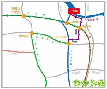 黄河滩园区地址:河南省郑州市惠济区花园口镇石桥村 自驾路线:市区出发至北四环与东四环交叉口——向东300米石桥村向北直达十方缘