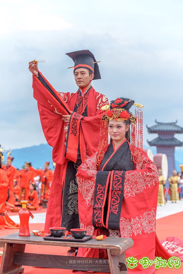 典礼开始,《开礼篇》以华章呈现、盛世起舞开篇,再现古风古韵之魅力;《主礼篇》分为雅乐起鼓(鼓乐齐奏,尽显汉风威仪)、盛世宣召(华章赞颂,礼乐相和,旗幡招展)、新人召进(君子翩翩,裙带华簪,以礼而入)、正衣肃颜(敬畏天地,文化彰显)、沃盥礼敬(净手素面,礼敬先贤)、对席起礼(长案对坐,四目期盼)、同牢合卺(三牢而食合卺而饮同甘共苦比翼齐肩)、交拜成仪(夫妇交拜,互敬款款)、解缨结发(结发成仪,夫妇百年)、执手礼成(执子之手,与子偕老)等十个环节,无一不体现汉式传统婚典文化的独特魅力!