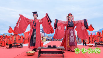 婚礼现场,气势恢宏,场面壮观。婚礼分为《开礼篇》《主礼篇》、《赞礼篇》三部分,采用古典婚礼的仪式与场景,再现汉代礼乐与婚庆文化。100对新人,在30位旗手、12位鼓手、15位舞者、6位侍女的护送下,在大主礼司、大领礼司、执礼官带领下,伴随着古朴典雅的音乐,步入会场。