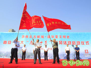 去哪游网讯:9月15日上午,商丘市 “喜迎十九大-商丘十景采风活动”启动仪式在帝和广场隆重举行,市委常委、宣传部长王全周宣布仪式启动,副市长岳爱云参加活动并为活动小组分别授旗,睢阳区委书记曹月坤为仪式致辞,商丘市摄影家协会主席张新根,市记者协会、诗词学会等嘉宾参加活动。