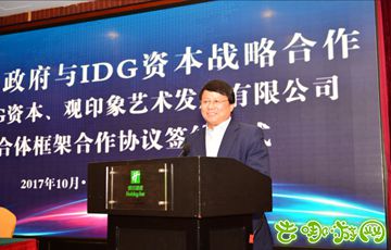 IDG资本全球董事长熊晓鸽在致辞中说,旅游业是环境友好型、生态友好型产业,也是富民增收的产业。平顶山旅游业发展方兴未艾。IDG资本将与平顶山政府一道,共同积极探索在旅游文化领域开展深入合作。IDG资本非常看好天瑞旅游丰富的业态资源和发展潜力,此次,我们将把IDG资本在投资乌镇及古北水镇所积累的经验带到中原大地,促进景区从单纯观光型旅游向旅游目的地转型。相信在双方的共同努力下,一定能把“尧山·中原大佛”文化旅游综合体项目打造成旅游文化精品项目,进一步提升景区核心业务资产的价值。同日,平顶山市政府还与IDG资本签署了促进旅游产业转型升级战略合作框架协议,为促进和提升“尧山文化旅游综合体项目”提供了保障。