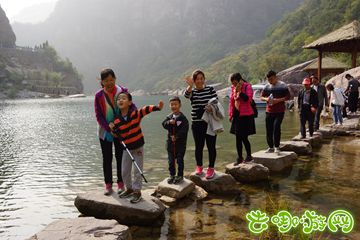 经过两个小时的路途顺利到达被称“中原小九寨”的宝泉景区,小伙伴们一下车都耐不住的一哄而散,欢呼着、喊叫着“好美的地方”,空气好,水多而透彻、就连早上藏起来的太阳此时也露出了笑容,天蓝水青山绿、绿中还有一片红。