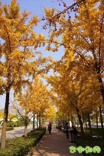 而此时,又是市民“扫黄”好时节,或三五好友、或祖孙三代、或模特摄影,总之,在金黄的银杏树下,或是一地的银杏叶上,一张张笑脸,一个个倩影,把这最多彩的秋之韵留在身后,留在心中。为了这份秋韵,骑士今天转遍郑州市区所有银杏林,传达这一日的“扫黄”结果。在郑州,最美的银杏林有高大的人民公园(人民公园南门口),浓郁的文博广场(河南省博物院东隔壁),广阔的烈士陵园(烈士陵园内东南角),漫长的中原路(西三环至西四环之间的中原路两侧人行道),河岸的东风渠(花园路和政七街之间的东风渠南岸),多彩的植物园(西四环与陇海路交叉口东北角)。