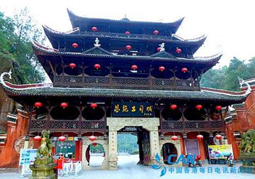 门楼前面左右两座神人牵着龙的雕像,叫作"天王送子",表现的是土家人普遍存在"望子成龙"心理 。右侧墙上三幅壁画,除中间一幅表现的是民族团结外,右边一幅是反映土家先民生活的"毛古斯"。"毛古斯"就是称之为的稻谷神。民以食为天,稻谷便与人的生存息息相关。对稻谷神的崇拜,反映了土家先民在农耕初期对生命存在的强烈意识。左边一幅的两个彪形大汉,环眼突睛,虎视眈眈,像似瞄着每个过往行人,那是土家语称作的"努里巴嘎"和"柯斗毛人",是土司城门楼的守护神。 土司城门楼高25米,宽12米,是栋纯粹榫卯结构的木楼。高大壮观、结构精良;布局精巧合理。两边走马转角楼梯可盘旋至顶,层层相通相连。门楼门窗由200扇门,189块镂空雕花图案组成,内容多为戏文及民间传奇故事。有趣的是,整座门楼还隐含着许多奇巧而又寓意双关的数字,如门楼高4层、12根柱、24根梁。那意味着什么呢?意味着一年中的4季、12个月和24个节气。还有门楼屋顶上数只蝙蝠拱托着一枚古钱的装饰雕塑,它叫"福在眼前"。福就是借指蝙蝠,钱就是那枚铜钱了。真算是无字胜似有字,于无声处说吉祥了。 坐落在游船码头对面山上的是土家族十分崇尚的先祖廪君庙,廪君庙为三层三进重檐廊柱式建筑,坐西朝东,雄峙山腰,巍峨气势。紧傍庙宇,沿山壁绘有巨大长卷壁画,壁画记载了廪君一生的豪情壮举,谓之"廪君开疆拓土胜迹图"。