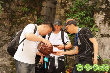 参加祈福仪式的媒体记者品尝摔碗酒