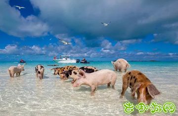 巴哈马猪岛 猪岛 (Pig island,又名Big Major Cay),位于巴哈马加勒比海,正式名称为大沙洲。这里因为岛上有自由自在生活繁衍的猪猪而闻名。据传这些猪的先辈们是多年前水手途径这座岛时留下的,希望作为日后航海时的食物补给。但当年的水手并未回去,小猪们就被这样留下了,在这个无人生活的小岛上自由自在繁衍生活,游泳晒太阳,可以说非常幸福了。