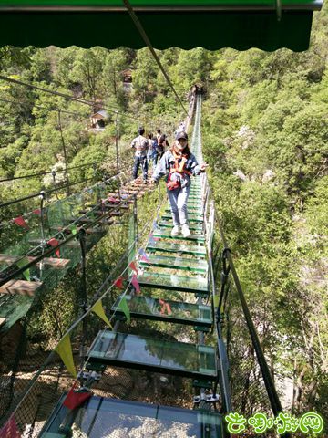 既然来了,怎舍得错过龙潭沟网红高空探险桥?探险桥位于九龙圣母潭上方,全长118米,离地100多米。置身于探险桥上,向前可欣赏到秀美壮观的四连瀑布,向下可俯瞰龙潭沟潭瀑相连,曲径通幽,可谓美不胜收!远远看去,像是被“挂”在一幅春意盎然的山水图里。