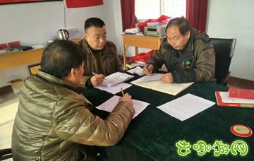 上断村党支部书记贾麦群(右一)、驻村第一书记马晓(中)村委委员李建超在研究发展规划