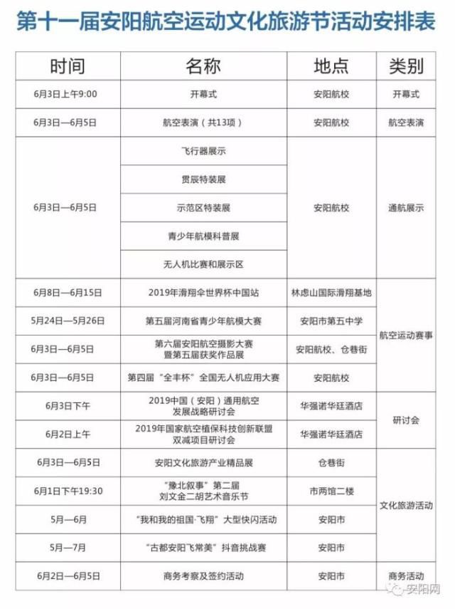 从新闻发布会上获悉,第十一届安阳航空运动文化旅游节精彩看点有五个方面:一是“空中芭蕾”。由国家跳伞队运动员担纲表演,届时安排6架飞机、30余名运动员一起跳伞,蔚为壮观。二是“龙腾盛世”。由30名国内顶级水平的动力伞运动员表演,或一字排开,或多路并进,上下翻腾,如巨龙飞舞。三是“特技飞行”。国际顶尖飞行员执飞,上演翻转、俯冲、筋斗、对冲等高难度技巧,特别是喷气式战斗机单机特技飞行精彩绝伦。四是“竞速表演”。飞机与汽车、摩托车同场竞速,现场版的速度与激情扣人心弦。五是“角逐蓝天”。2019年滑翔伞世界杯中国站比赛,时隔九年重返中国、花落安阳,来自世界各地的顶级运动员将在太行之巅一决胜负。同时,第五届河南省青少年航模大赛、第四届“全丰杯”全国无人机应用大赛等也将相继登场。