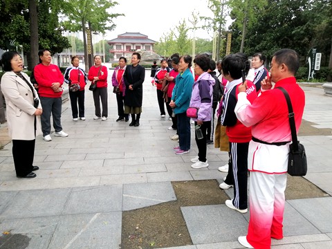 最后,河南省营养保健协会康养旅游专委会秘书长、趣哪悠康旅总经理李枫为大家邀请到潘安故里大潘庄原村委会主任、潘安非遗文化传承人、潘安第65世后裔潘长林主任,河南省农业职业学院教授、《潘岳文化》主编、潘安非遗文化传承人陈会丽教授,以及著名书法家王书坤、中牟知名人士曹纪力等中牟文化界名人大咖接待了表演团一行,并由陈教授亲自带领参观潘安园,讲解潘安的历史文化故事。潘安园的一草一木,一花一叶,一砖一石、一墙一瓦,从大门广场到纪念碑亭、从潘安墓到潘安碑、从潘安像到秋兴楼(文化馆)、从潘安湖到书画院,无不透露着潘安文化久传不衰的底蕴。