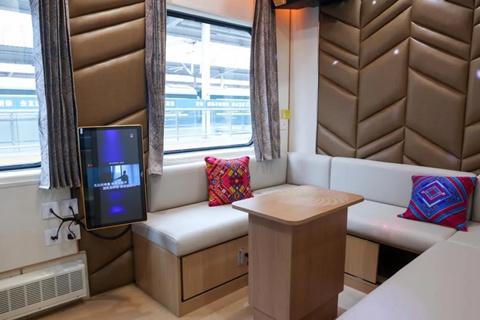 广西旅游年银发旅游专列以适老化、舒适化为核心,配备防滑扶手、紧急呼叫系统和随车医护,确保出行安全无忧。多功能娱乐车厢涵盖KTV、棋牌室、VR影院及休闲吧台,配备的VR体感座椅可为游客提供“飞跃式”旅途体验。