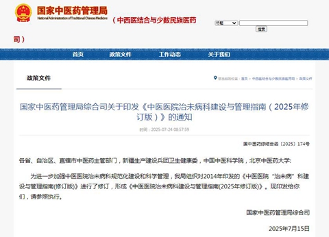 去哪游讯:7月15日,为深入贯彻落实党中央、国务院决策部署,实施健康优先发展战略,根据《中华人民共和国中医药法》《“健康中国2030”规划纲要》《中共中央 国务院关于促进中医药传承创新发展的意见》等有关文件,为进一步加强中医医院治未病科规范化建设和科学管理,提高治未病服务水平和能力,国家中医药管理局印发《中医医院治未病科建设与管理指南(2025年修订版)》,二级及以上中医医院(中西医结合医院)开设治未病科,以中医治未病理论为核心,辨识人体健康状态,运用中医药技术和方法及现代健康管理技术方法,系统维护和提升人体整体功能状态,降低疾病风险、延缓疾病进展、促进病后康复,开展全生命周期、全过程健康服务,努力实现“以治病为中心”向“以人民健康为中心”转变。