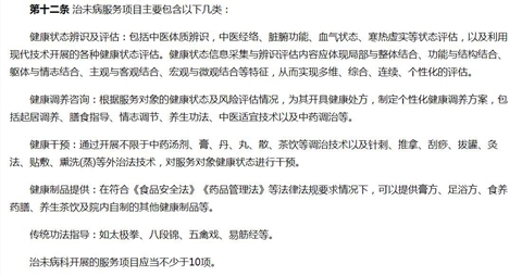 服务项目主要包含:健康评估、健康调养咨询、健康干预、健康制品提供、传统功法指导五项内容,其中开具健康处方,制定个性化健康调养方案,包含起居调养、膳食指导、情志调节、养生功法、中医适宜技术以及中药调治等。同时治未病科开展的服务项目从之前的“不少于5项”调整为“不少于10项”。