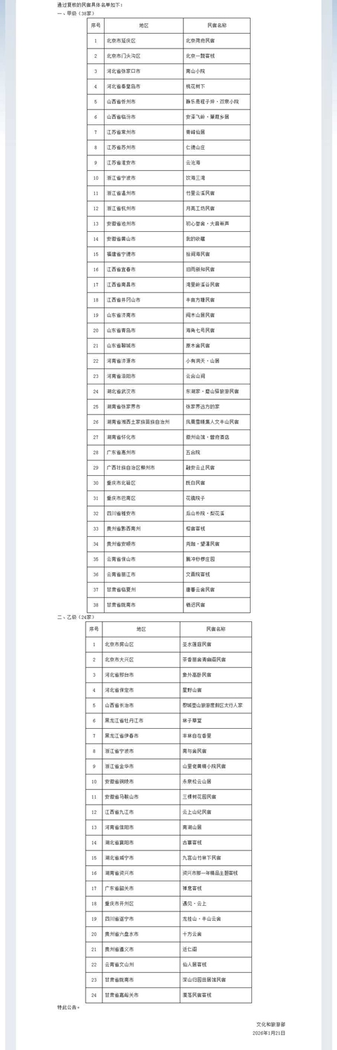 去哪游讯:1月26日,文旅部发布2025年新增全国甲级、乙级旅游民宿和复核结果名单公告。根据《〈旅游民宿基本要求与等级划分〉(GB/T 41648—2022)实施工作导则》,经评定,81家旅游民宿符合全国甲级旅游民宿标准,104家旅游民宿符合全国乙级旅游民宿标准。经复核,2022年评定的71家全国甲级、乙级旅游民宿中,38家旅游民宿符合全国甲级旅游民宿标准,24家旅游民宿符合全国乙级旅游民宿标准。评定结果有效期为三年,期满须复核,并再次公布复核结果。