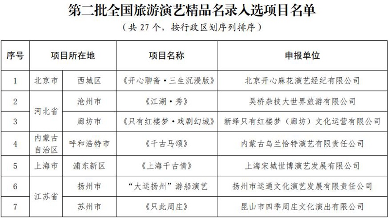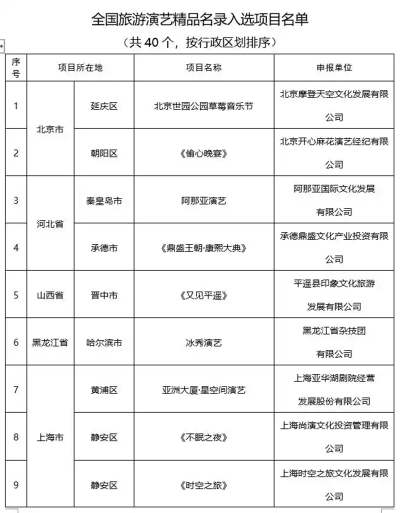 去哪游讯:近日,文旅部公布第二批全国旅游演艺精品名录入选项目名单(27个)。为深化以文塑旅、以旅彰文,发挥旅游演艺精品项目示范带动作用,推动旅游演艺行业提质增效,推进文化产业和旅游产业深度融合发展,按照思想内涵深刻、艺术表现精湛、业态模式创新、市场反响良好、运营管理有效、带动消费作用明显、社会效益和经济效益显著的标准对全国各地旅游演艺项目进行评定。包括2023年9月公布的首批名录(40个),最值得一看的全国旅游演艺精品总数达到67个。