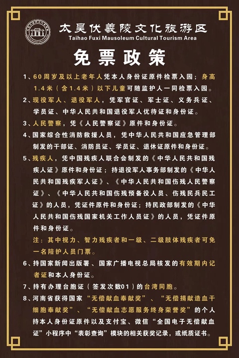 2、除60岁以上人群外,其他免票人群需到优待票专用窗口作登记后刷身份证入园。 3、本免票政策仅适用于太昊陵景区门票,龙湖游船及其他二次消费项目均不在此政策适用范围之内。 4、本免票政策自2026年2月3日起执行。