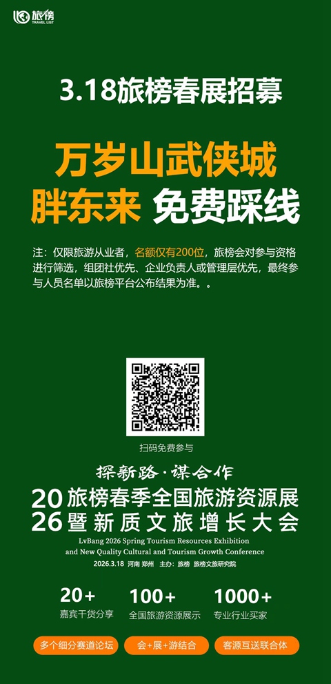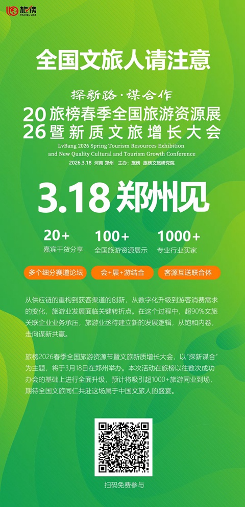 去哪游讯:据去哪游获悉,由旅榜文旅研究院主办,以“探新路 谋合作”为主题的2026旅榜全国春季旅游资源展暨新质文旅增长大会将于3.18郑州举行。超20位嘉宾主题分享,全程包含会议、展览和景区踩线,预计吸引超千家文旅企业参与。