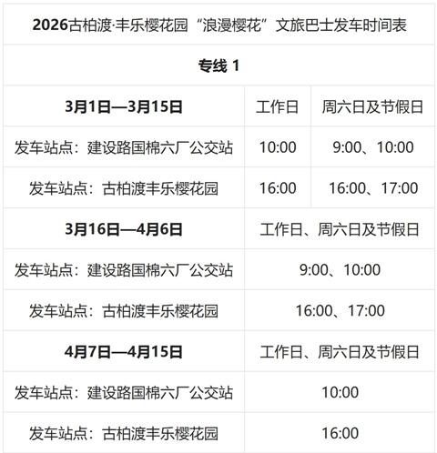 樱花巴士1:建设路国棉六厂公交站—古柏渡丰乐樱花园 运营时间:3月1日—4月15日 乘车票价:单程10元,乘车买景区门票专享价50元/人(根据花期和人群价格有所变动,购票时询问清楚),可免费乘专线车辆往返。 乘车时间:如下图