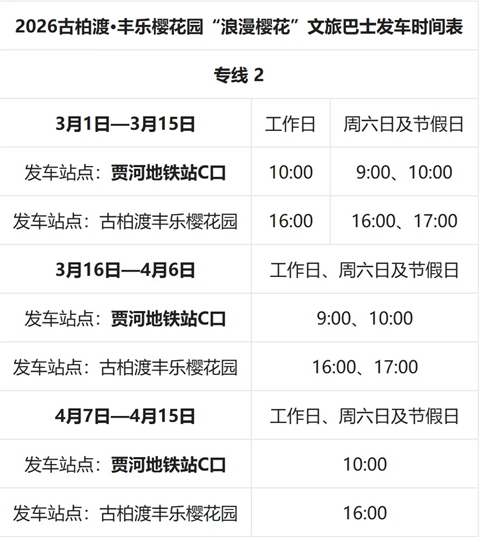 樱花巴士2:地铁2号线贾河地铁站C口—古柏渡丰乐樱花园 运营时间:3月1日—4月15日 乘车票价:单程10元,乘车买景区门票专享价50元/人(根据花期和人群价格有所变动,购票时询问清楚),可免费乘专线车辆往返。 乘车时间:如下图