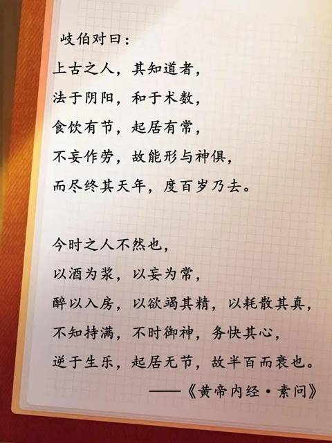 养生、长寿在中国自古以来都是永恒的话题,在春秋战国时期已成养生典籍的《黄帝内经》,而成书于商周时期的《易经》以及历代道家、医家所著名篇名著,无不提倡健康生活方式。总之,养生就是“法于阴阳,和于术数,食饮有节,起居有常,不妄作劳,形与神俱,而尽终其天年,度百岁乃去 。一讲“必顺四时而适寒暑,和喜怒而安居处,节阴阳而调刚柔,如是则僻邪不至,长生久视”。一讲“五谷为养,五果为助,五畜为益,五菜为充,气味合而服之,以补精益气”。 三段话讲明了吃动平衡、心理平衡、情绪稳定、运动劳作有节、顺四季而平阴阳,凡事皆有度。新时代新人类,科技发展了,人变懒了,机器聪明了,人却傻了。寿命长了,带病生存时间也长了。