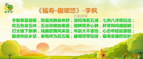 一首诗更是把趣哪悠康旅打造的十全十美健康享老生活新方式描绘的淋漓尽致。趣哪悠康旅在此基础上不定时举行七大主题康养游、八大主题康养赛等康旅活动。 |