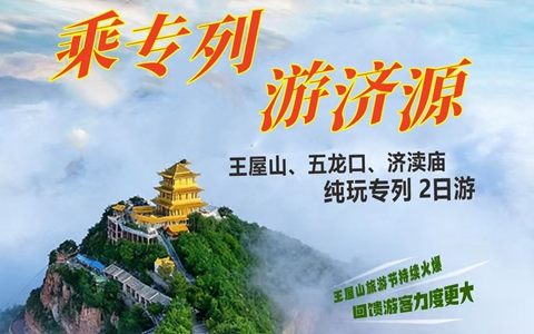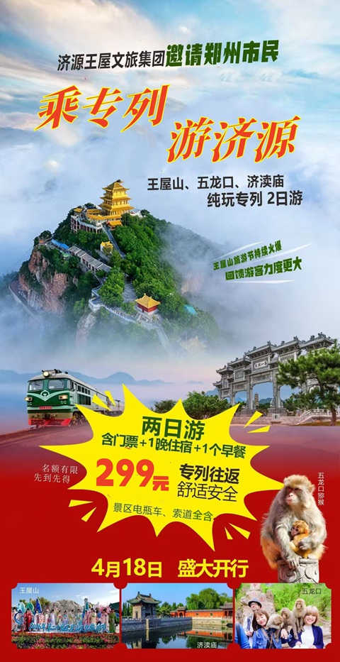 【活动亮点】 1、火车专列、一票往返、舒适安全、仅此一班; 2、天下洞天之首,感受道家福地文化; 3、愚公精神发源地,学习红色文化; 4、五龙口天下第一梯,太行猕猴近距离观赏; 5、天下第一水神庙,被称为“水上故宫”的济渎庙; 6、专列抵达,文旅部门盛大欢迎仪式; 7、住宿、门票、景交、索道一价全含;
